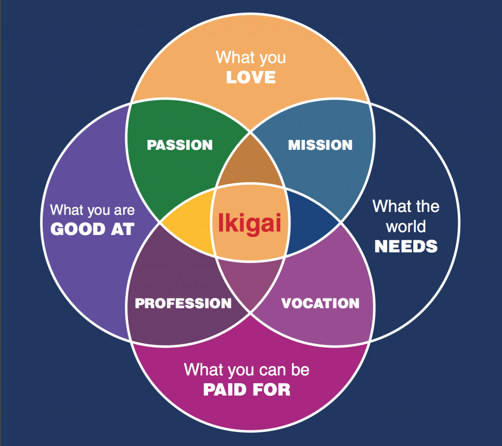 The image summarises the core ingredients to finding your life purpose and how they are interrelated and how they combine to reach your Ikigai. The concept of Ikigai (pronounced ee-key-guy) was developed by clinical psychologist, Akihiro Hasegama based on Japanese life philosophy. It roughly translates into English as ‘your purpose in life’ or ‘your reason for being’.